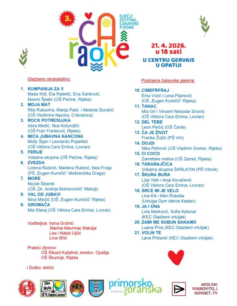 U utorak 21. 4.2026. u Centru Gervais u Opatiji s početkom u 18.00 h održat će se Dječji festival čakavske pjesme 3. ČAraoke.