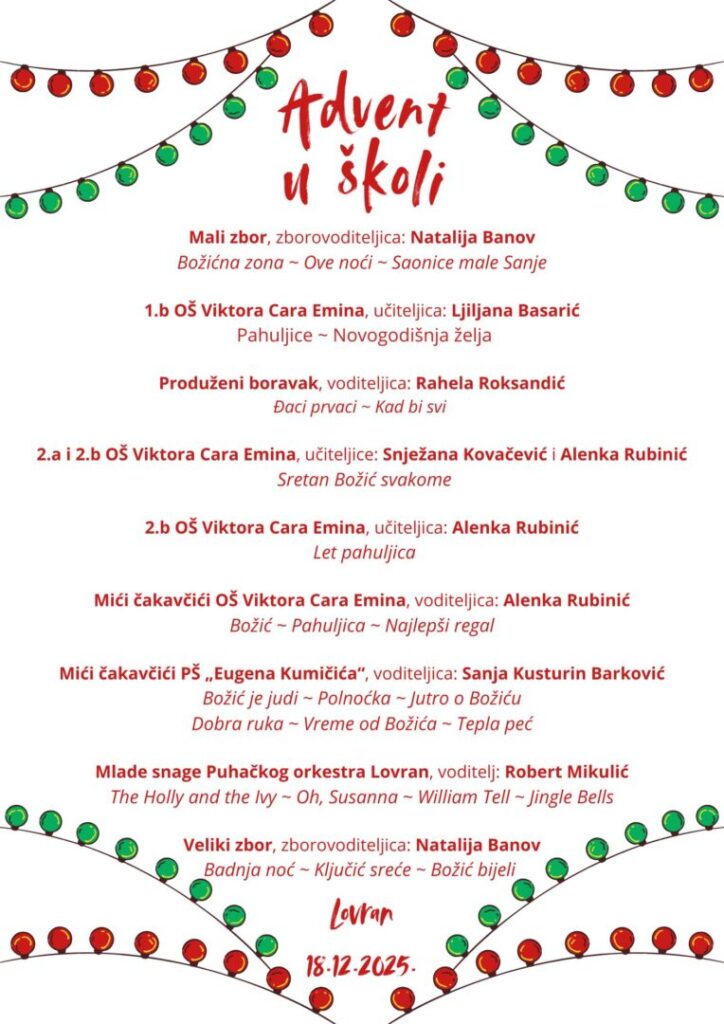 Pripremili smo veselu atmosferu i dobar program — a da se ne biste baš skroz iznenadili, u nastavku pogledajte tko nastupa. Što vas još čeka, provjerite večeras u našoj školi!