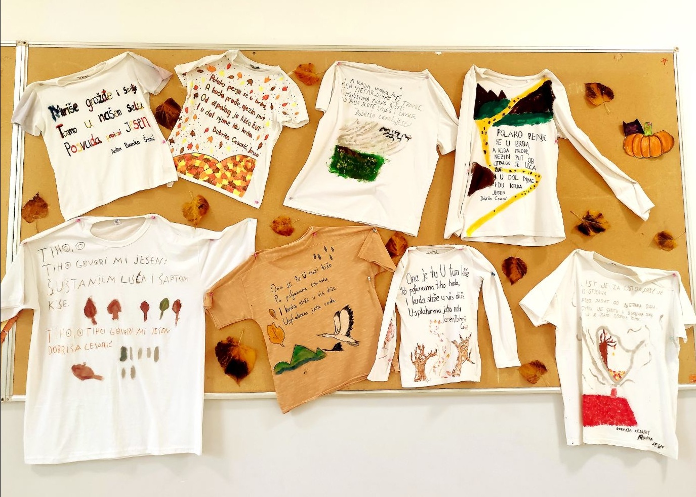 Na početku radionice, učiteljica je pustila zvučni zapis pjesme Dobriše Cesarića – Jesen koja je učenicima poslužila kao inspiracija za oslikavanje majica. Slikali su vodenim bojama, flomasterima i temperama, uz laganu glazbenu pozadinu s pjesmama Olivera Dragojevića. Učenici su se zabavili i kreativno izrazili te potom svoje uratke predstavili na hodničkom panou, gdje sada krase zidove škole.
