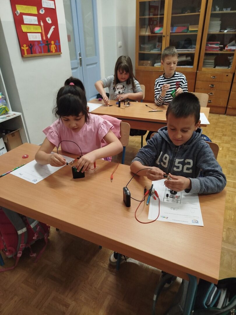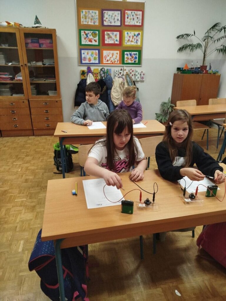 Učenici su spajali jednostavni strujni krug i istraživali kako moraju spojiti žaruljicu, bateriju, spojne žice i krokodil štipaljke kako bi žaruljica svijetlila.