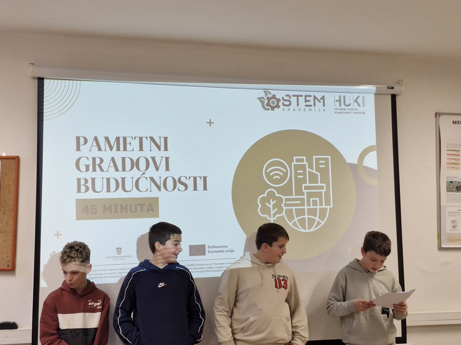 Učenici 6.a. prošlog su utorka 27.studenog 2025. sudjelovali na radionicama STEM Akademije: Pametni gradovi budućnosti. Cilj projekta je popularizacija STEM područja među djecom (programsko inženjerstvo, sistemsko inženjerstvo, multimedijska produkcija, 3D dizajn, razvoj računalnih igara, poslovna znanost i umjetna inteligencija, podatkovna znanost). Predavači su učenike najprije upoznali s  pojmom pametni grad, koji su gradovi pametni gradovi (Barcelona, Singapur….), provodili su debatu među učenicima. Učenici su zatim osmišljavali rješenje za problem koji se nalazi u njihovom mjestu stanovanja.