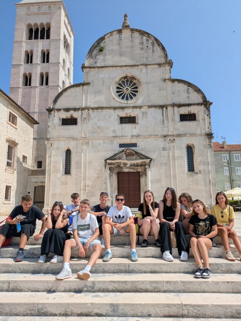 Ekskurzija je započela u Zadru, gdje su učenici posjetili kultne Morske orgulje – arhitektonski glazbeni instrument kojim valovi i vjetar stvaraju melodične tonove kroz sustav cijevi skrivenih ispod bijelih mramornih stepenica. Razgledali su i instalaciju “Pozdrav suncu”, solarni krug od stakla koji svijetli nakon zalaska sunca. Nakon vizualnog i auditivnog doživljaja na obali, učenici su obišli centar Zadra te saznali zanimljivosti o povijesnim lokalitetima.